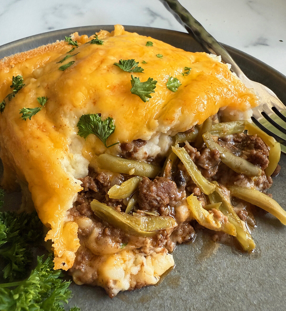 Your favorite Irish comfort food, but in casserole form. This shepherd’s pie switches things up with mushrooms and green beans, layered with ground beef, creamy mashed potatoes, and a cheesy cheddar topping. It’s an easy, savory meal that’s perfect for feeding the whole household.