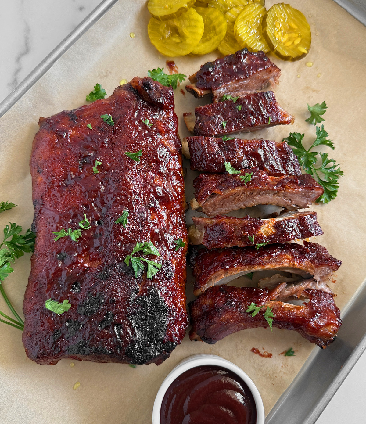 - Carefully transfer ribs to a foil-lined baking sheet. Brush with BBQ sauce and broil on high for 3–5 minutes until the sauce bubbles and caramelizes. Watch closely so they don’t burn. Brush with more sauce if desired, then serve.